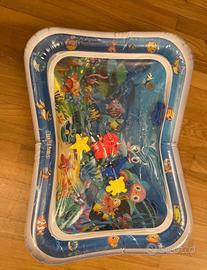 tappetino di grande intrattenimento per tummy time neonato. si riempie con acqua e il bambino può giocare con i pesciolini muovendoli all'interno. E' portatile perché si piega come un piccolo materassino gonfiabile.