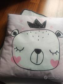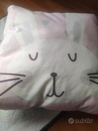 tappetino rosa sbiadito e due cuscini fondo rosa con orsetto e coniglio, sono da rinfrescare perché c e qualche macchiolina che non so vede subito e che al lavaggio sicuramente viene via, comunque sono in buono stato.britiro Roma Marconi San paolo