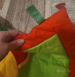 con elementi interattivi: il nasetto e il vasetto di api, se premuti (a mano) fanno un suono tipo clascon, l'orecchio è di vellutino morbido, il piede ha dei pallini in rilievo il cappello scricchiola. Ad ogni angolo c'è un gancio...può anche essere appeso. Misura 84×90.