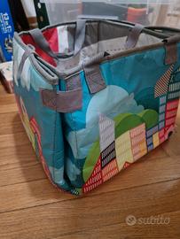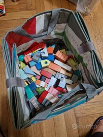 tappeto con una piccola città e tutti pezzi in legno per costruire la città e alcune macchinine.