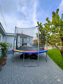 Vendo trampolino elastico (saltarello) con rete di sicurezza, diametro circa 3,6 metri. ✔ Struttura robusta in metallo ✔ Rete protettiva integra ✔ Tappeto elastico in ottime condizioni ✔ Paracolpi colorato sostituito lo scorso anno ✔ Ideale per bambini, ragazzi ed adulti ✔ modello Decathlon essenzial 360 Usato ma perfettamente funzionante, sempre tenuto in giardino privato. 📍 Ritiro a mano Candiolo - (TO) Disponibile da subito. Trasporto a carico dell'acquirente. Posso dare una mano a smontarlo e caricarlo