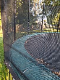 Vendo tappeto elastico di 3 anni, diametro 5 metri, perfettamente funzionante. La cerniera della rete di protezione è rotta, ma sistemabile. Le tavole che si vedono in foto servono perché il tagliaerba non si incastri e sono rimovibili.