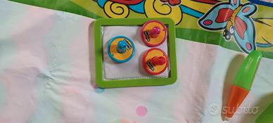 contiene una matita da ricaricare con acqua con cui scrivere e disegnare, un pennello con vaschetta carica di acqua per poterlo intingere e 3 stampini da passare nel vassoio con spugna bagnata.