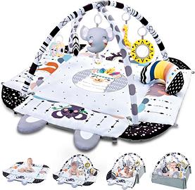 6 in 1 Kids Play Mat:Our forest themed play mat is quadrilateral and the main colors are white and black. Includes 3 cloth toys with sound effects (giraffe, tree, elephant), a mirror for self-exploration, a safety teat, a tummy time cushion to encourage your baby to explore, learn and grow.