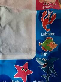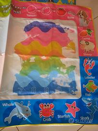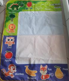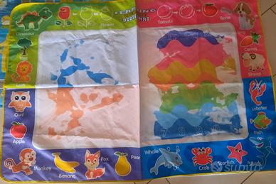 Vendo tappeto per disegnare per penne ad acqua, (non incluse). Il tappetino reagisce all'acqua creando colori arcobaleno da un lato e dall'altro solo alcuni colori, come da foto. I disegni scompaiono man mano che si asciuga, per un continuo riutilizzo. Sono presenti le lettere dell'alfabeto e alcuni nomi di animali in lingua inglese. Prezzo 8 Euro. Misure 147,5x98,5 cm. Ritiro a mano su Roma, zona Arco di travertino e Colli Albani.