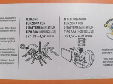 Necessita di 6 batterie AAA non presenti nella confezione, 3 per il telecomando e 3 per la tarantola.