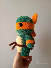 Tartaruga Ninja Michelangelo in morbida ciniglia. Fatto all'uncinetto con la tecnica amigurumi. Altezza - 19 cm