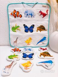 Formato grande di panello in cotone e 9 tasche con 9 animali dentro. Incastrare, tirare fuori! Giochi Montessori.
