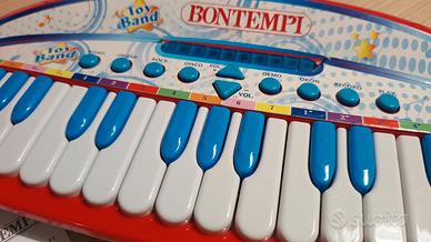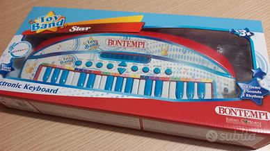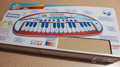 Tastiera elettronica per bambini a 18 tasti con effetti luminosi, 2 suoni (piano e organo), 2 ritmi (disco e rock), 10 brani registrati, e altre funzioni. In buone condizioni, funzionante a batteria ed in scatola originale.