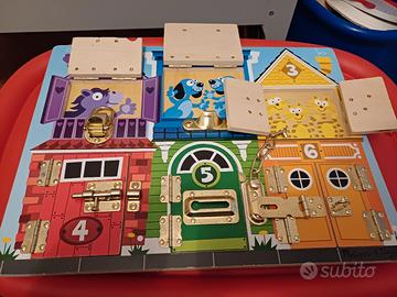 Tavola in legno con chiavistelli di Melissa & Doug.Si tratta di un giocattolo educativo che aiuta i bambini a sviluppare la manualità e le capacità motorie.