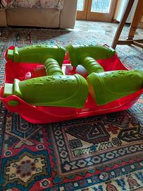 Il tavolino si chiude a valigetta per essere trasportato ed è dotato di un utilissimo vano porta giochi compatibile con tutti i prodotti della linea Sapientino.