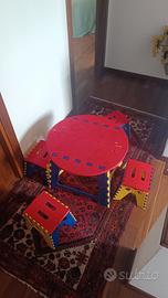 Tavolino rotondo con 5 panchine tre colori blu giallo rosso. Usata pochissimo tenuta bene non ha nessun difetto.