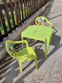 Vendo un tavolino con due poltroncine per gioco bimbi/e, comodo anche per cameretta dove possono appoggiarsi per disegnare o fare i propri giochi, facile da lavare perché in materiale plastico.