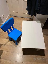 Tavolino di legno e sedia di plastica blu per bimbi ikea, usato pochissimo, come nuovi