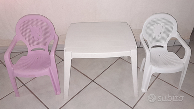 Vendo tavolino largo 53 per 44 cm ed alto 46cm con due sedioline. Adatto anche per l'esterno.