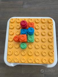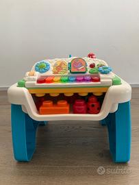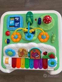 Tavolino Chicco con lato musicale con giochi sonori e pianola( che si può anche estrarre e appendere al passeggino) e lato con mattoncini colorati ad incastro. Si può smontare. Come nuovo.