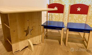 Vendo tavolino in legno per bambini marca KidKraft, con 2 seggioline blu e rosse, 1 contenitore portaoggetti, usato come da foto (alcune imperfezioni dovute all'uso). Ritiro a mano in luogo da concordare.
