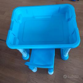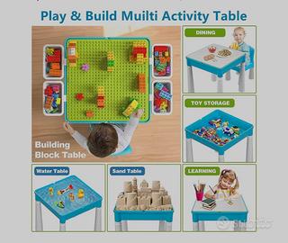Può diventare contenitore per Lego, sabbiera, giochi con acqua, tavolino classico, o grande piastra compatibile con mattoncini Unico.