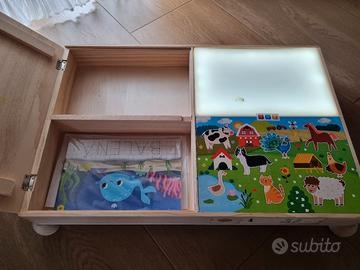 Tavolino Montessori multi attività con luce e suoni di animali, perfettamente funzionante. Qualche segno di utilizzo, ma nulla da compromettere l'attività.