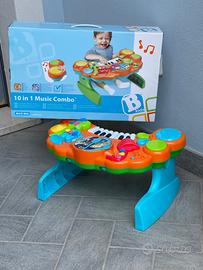 Funziona con 2 batterie stilo AA. Completo di scatola in perfette condizioni MISURE Altezza (articolo + pacchetto): 38.2cm Lunghezza (articolo + pacchetto): 58.7cm Larghezza (articolo + pacchetto): 30cm Peso: 5.38kg Grandi pulsanti e tanti strumenti per fare musica in modo semplice e divertente. – 10 strumenti tra cui scegliere: tastiera, tamburo, sax, chitarra, piatti e molto altro. – Un libro musicale con tante canzoni: oltre 25 melodie e suoni per intrattenere il tuo bambino. – Le gambe sono rimovibili per poter giocare comodamente ovunque.