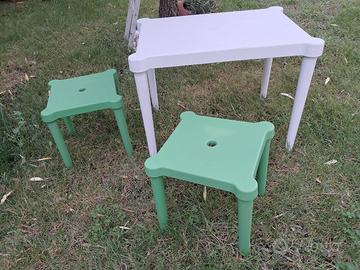 Vendo tavolino bianco con 2 sedioline verdi in plastica dura per bambini in ottime condizioni. Le zampe sono svitabili quindi facilmente riponibile.