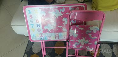 Vendo set di 2 pezzi (tavolo e sedia x bimbo) di colore viola con decoro unicorni (marchio Galileo Casa). Seduta in PVC, struttura tubolare in ferro, richiudibili e salvaspazio. Misure del tavolo: 60 x 40 con altezza da terra di 50 o 54 cm. Misure della sedia: 34 x 31 x 54, altezza della seduta da terra 25 cm. Cedo ad euro 20,00 il set. Solo con ritiro diretto, a mano.