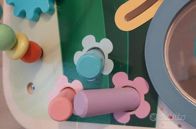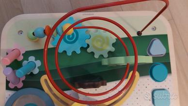 Tavolo multiattività in legno Wood 'N Play: gioco delle forme e degli incastri, labirinto, xilofono e ingranaggi.