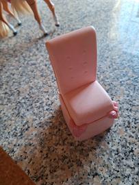 Tavoli rettangolare Barbie con 2 poltroncine anni 90. Cena per 2. Il tavolo ha il piano trasparente con al centro un vassoio con i pasticcini che si può capovolgere e diventa con pollo arrosto