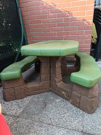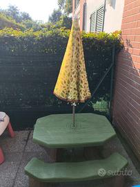 Tavolo con doppie panche per giardino, con aggiunta di ombrellone. Ottime condizioni.