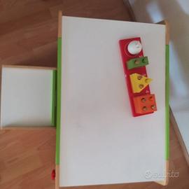 Il tavolo con la sedia di legno per disegnare e giocare. La struttura è molto stabile. Tavolino studiato per disegnare in continuo sul rotolo di carta, fissato con l'asta porta-rotolo. lo sgabello è molto pratico con grande contenitore. Adatto ai bambini di 2/5 anni.