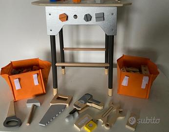 -Banco da lavoro giocattolo in legno ed elementi in plastica.