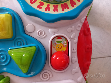 Tante canzoni, musiche e le filasctrocche nel nuovo e coloratissimo tavolo attività GLI AMICI DEL BOSCO accompagnano il bambino alla scoperta di lettere, numeri, forme, colori e tante nuove parole anche in inglese. Il libro-mela racconta la storia del bruco che si trasforma in farfalla; la rana si allunga e salte; premendo l'uccellino l'albero insegna i numeri; l'orologio con il coniglio introduce l'alfabeto; infine c'è un laghetto con simpatiche formine e un funghetto con 3 tasti musicali luminosi.