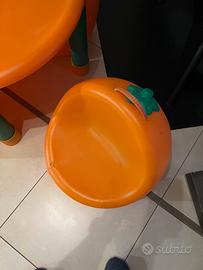Vendo tavolo della chicco arancia, tavolo in buonissime condizioni, con 4 sedie arancia. Delle 4 sedie una ha una piccola rottura, come si vede in foto, che non complica l’utilizzo.