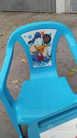 Vendo tavolo e due sedie in plastica per bambini di colore azzurro con personaggi Disney (Topolino, Pluto, Paperino). Sono oggetti usati ma in buone condizioni.