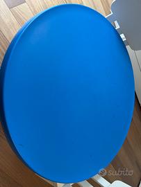 Tavolo per bambini Ikea (per interno/esterno), blu, diametro 85 cm, con qualche graffio e segno di usura. Sedie per bambini Ikea (2, per interno/esterno), bianche.