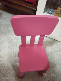 Vendo tavolo Ikea Mammut di colore bianco misure 77x55x48(h) e sedia Ikea Mammut di colore rosa misure 39x36x67(h) (seduta misure 30x26).