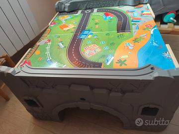 Hape Tavolo Ferroviario con treni e binari - Set da 70 Pezzi con locomotiva a batteria, binari in legno, passaggio a livello, gru magnetica