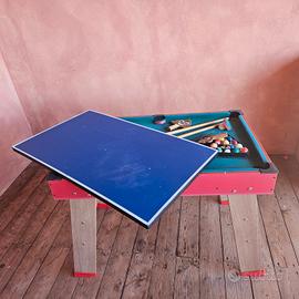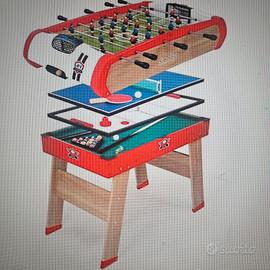 Tavolo multi gioco con biliardo, calcetto, hockey e ping pong. Compatto in legno. Preferibile ritiro. Nel caso spedizione da valutare a causa dimensioni. Prezzo al nuovo 295€. Peso 39kg.