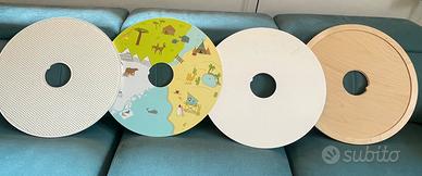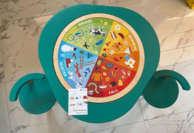 Vendo tavolo regolabile in 3 altezze MUTABLE MUKAKO (prima che venisse acquistato e industrializzato da Stokke) colore TIFFANY. Il tavolo è in ottime condizioni comprende 4 piani a disco intercambiali: - legno (entrambe i lati sono LEGGERMENTE segnati) - piano lavagna e bianco (lavagna LEGGERMENTE segnato e bianco segni di colore come da foto) - disegno natura e disegno città - compatibile lego e duplo Sedie in ottime condizioni VENDO IN BLOCCO Regalo 2 puzzle originali conpleti come da foto Vendo tramite TuttoSubito per la tutela della vendita e dell’acquisto Preferirei consegna a mano ma posso anche spedire nelle scatole originali
