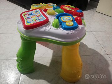 È un divertente tavolino chiacchierone con tanti tastoni interattivi pensati per stimolare l'interazione con il bambino. Elettronico educativo parlante insegna i primi numeri, le lettere, le forme e i colori. Stimola la manualità e la percezione visiva e uditiva. I tre tastoni delle forme si illuminano. Il lettore e la tastiera musicale suonano tante allegre canzoncine. Un colorato libricino insegna le lettere e i nomi degli animali.