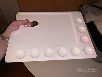 Una Tavolozza GRANDE VINTAGE MA IN OTTIME CONDIZIONI,Tenuta Molto Molto Bene,USATA POCHE VOLTE ALLA SCUOLA SUPERIORE Istituto d’arte nel 1’ anno,per adulti e ragazzi e bambini,con 9 spazi rotondi più lo spazio nel rettangolo al centro che si può usare per la pittura/colore a olio/tempere ecc,MADE IN ITALY,IN PLASTICA RIGIDA BIANCA,Al centro con bordo rialzato per usarla per i colori senza che coli fuori,INTEGRA,è esattamente come in foto:l’ho già pulita io bene(è pulita perfettamente),vendo per inutilizzo.
