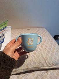 Bicchiere o tazza color azzurro con disegnato un pinguino, con due manici.