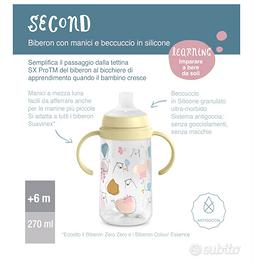 Tazze didattiche con beccuccio in silicone morbido antigoccia che facilita il passaggio dalla tettarella al bicchiere, con sistema anticolica e manici removibili adatti alle piccole manine e posizionabili su qualsiasi altro biberon Suavinex e intercambiabili fra loro Capacità 270. Una delle 2 è senza tappo perché accidentalmente caduto e rotto. Mai usate perché la mia bimba non ha mai voluto provarle.