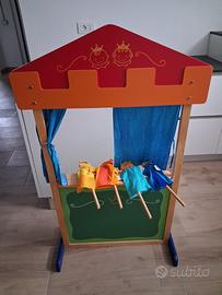 Teatrino con struttura in legno. In dotazione 4 marionette anch'esse in legno e con vestiti in tessuto. In condizioni ottime.
