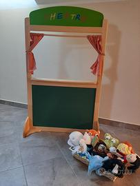 teatrino in legno, altezza 115cm. larghezza 0,70cm. completo di cesta con 11 personaggi per giocare e liberare la fantasia.