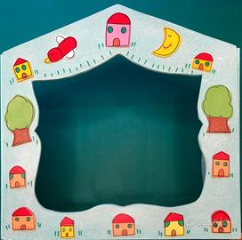 Bellissimo teatrino in legno per burattini - marionette, mis. L. 62, H. 63 chiuso, L. 122 tutto aperto, completo di ben nove personaggi per rappresentare le favole Biancaneve e i sette nani e Pinocchio, ognuno con dimensioni medie di cm. 20-25.
