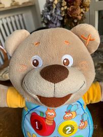 Premendo i pulsanti luminosi sulla pancia dell'orsetto, il bambino si diverte con allegre filastrocche, conta insieme a lui e scopre i nomi dei frutti e degli animali.