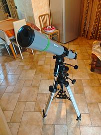 Vendo telescopio BRESSER 90/900 Space Explorer che ti mostrerà le meraviglie dello spazio. Grazie all'apertura di 90 mm, il telescopio cattura 165 volte più luce dell'occhio umano. Il telescopio rifrattore è montato su un robusto treppiede in alluminio per garantire la massima stabilità durante le tue osservazioni. C'è anche un ripiano per accessori per riporre gli occhi, un obiettivo Barlow e altri accessori. Puoi compensare i movimenti della terra per assicurarti che le tue scoperte celesti rimangano all'interno del campo visivo: la montatura equatoriale EQ3 ti consente di guidare manualmente il telescopio e seguire i tuoi oggetti nel tuo viaggio attraverso il cielo notturno. Ammira i maestosi anelli di Saturno e il gigante gassoso Giove in diversi aumenti con gli oculari di 4 mm, 12 mm e 20 mm. Nelle notti buie e senza luna, sono visibili anche le nebulose di gas più luminose, le galassie e gli ammassi stellari. Se sei affascinato dalla luna, avvitare il filtro lunare sul retro di uno degli oculari. Il cercatore di punti rossi offre un modo semplice per orientarsi nel cielo notturno. Una volta impostato il motore di ricerca sul telescopio, il piccolo punto rosso ti mostrerà la direzione in cui punta il telescopio. gamba focale massima: 900,0 millimetri. Strumento usato solo due volte. Condizioni pari al nuovo.