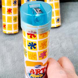 Simpatici portamatite in latta colorata con coperchio che funge anche da temperino. Forma cilindrica, altezza cm 20, diametro cm 3. Nuovi, mai usati, nessuna ammaccatura. Disponibili 4 pezzi. Vendo ad 1 euro al pezzo. Disney Art Attack