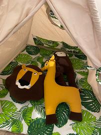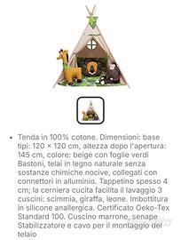 Tenda da indiani. Tenda da gioco per bambini. Tema giungla. Vendo per inutilizzo. Montata ma mai utilizzata. No scatola origibale Dimensioni: base tipi: 120 x 120 cm, altezza dopo l'apertura: 145 cm, colore: beige con foglie verdi Bastoni, telai in legno naturale senza sostanze chimiche nocive, collegati con connettori in alluminio. Tappetino spesso 4 cm; la cerniera cucita facilita il lavaggio 3 cuscini: scimmia, giraffa, leone. Imbottitura in silicone anallergica. Certificato Oeko-Tex Standard 100. Cuscino marrone, senape Stabilizzatore e cavo per il montaggio del telaio
